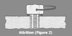 2. Attrition (Figure 2). Attrition is a combination of a dragging action combined with compression such as in a spark plug gasket where the spark plug is turned down on a gasket that is both compressed and screwed into the flange.